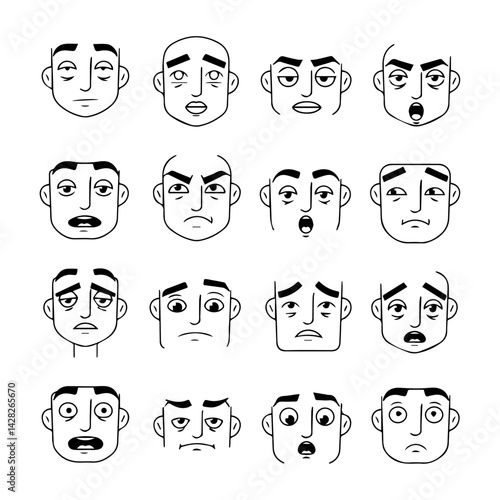 © mamunit1, Fototapeta premium Collection of sixteen cartoon faces with different expressions in black and white line art style