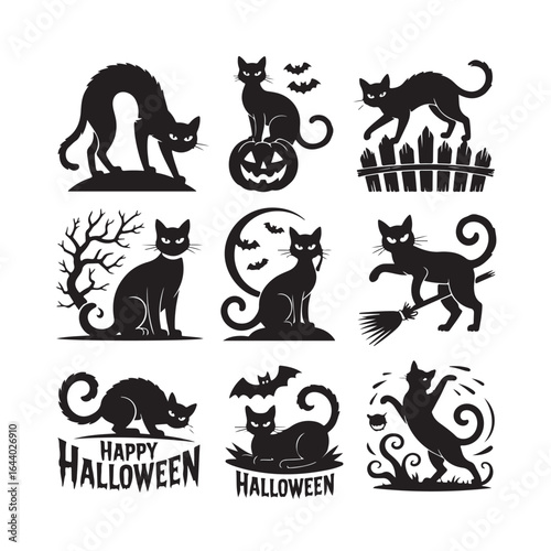 Obraz premium Collection of spooky black cat silhouettes with halloween themed elements