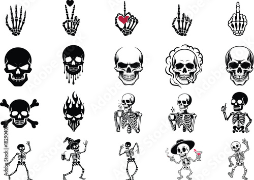 Naklejka premium Collection of spooky skeleton illustrations, perfect for halloween designs, tattoo art, or edgy graphic projects