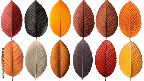 © Alfazet Chronicles, Obraz premium Collection of stylized autumn leaves in various colors arranged in rows on a white background.