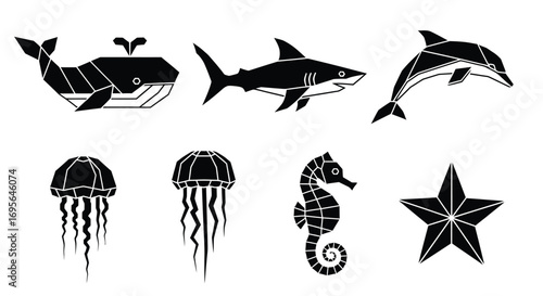 Fototapeta premium Collection of stylized black and white aquatic animals, including whale, shark, dolphin, jellyfish, seahorse, and starfish.