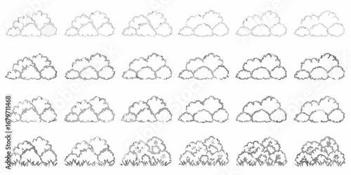 © Juel, Fototapeta premium Collection of stylized grey and white fluffy clouds and bushes isolated on white background