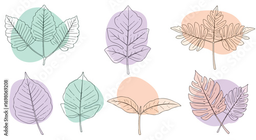 © Seemsalabeem, Obraz premium Collection of Stylized Line Art Leaf Illustrations with Colorful Backgrounds.