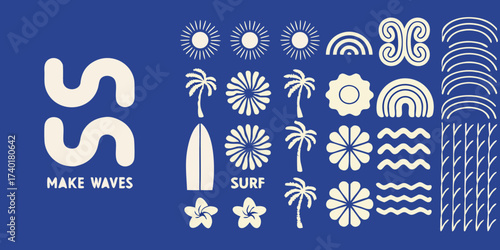 Fototapeta premium Collection of stylized summer icons and graphic elements on a blue background with the words make waves and surf