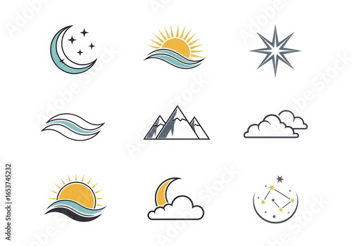 Obraz premium Collection of stylized weather and nature icons including sun moon clouds mountains and compass