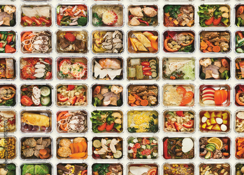 © Prostock-studio, Obraz premium Collection of take away foil boxes with healthy food. Set of containers with everyday meals - meat, vegetables and law fat snacks on white background, top view, seamless