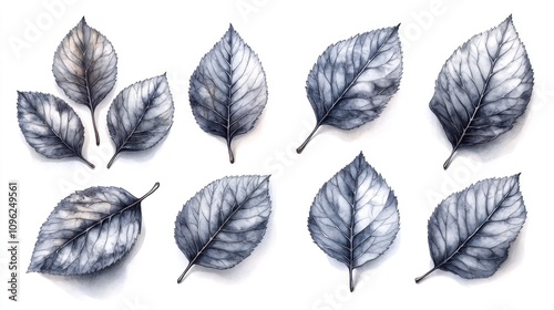 © Muamanah, Fototapeta premium Collection of Ten Watercolor Leaves in Monochrome Shades