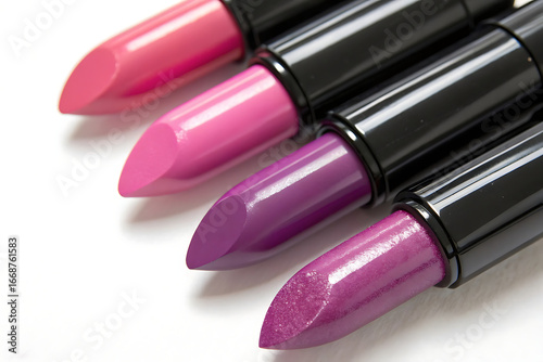 © MD, Obraz premium Collection of three new pink lipsticks on white background, copy space. Femininity, makeup, decorative cosmetic, beauty concept