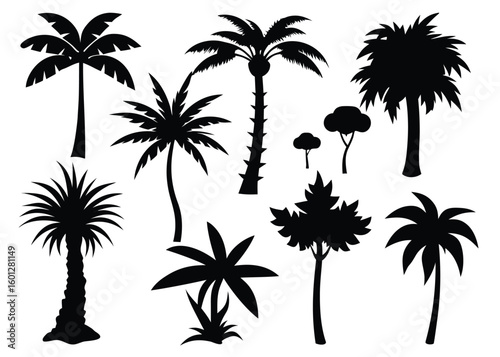 Fototapeta premium Collection of 10 tropical tree silhouettes isolated on white background