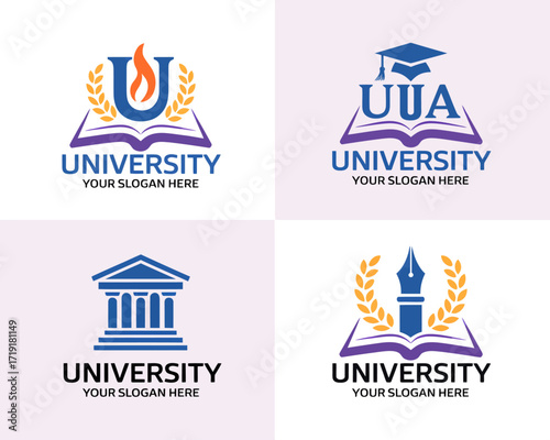 Fototapeta premium Collection of university logos with open books, graduation caps, and...