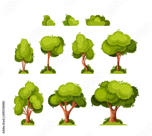 © Pavlo Syvak, Fototapeta premium Collection Of Various Cartoon Green Trees And Bushes Isolated On White Background Perfect For Game Design