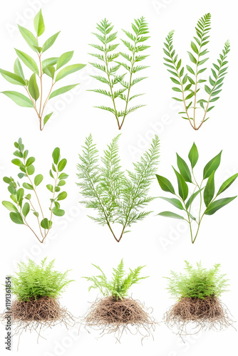 Naklejka premium Collection of various green plants, ferns, and grasses isolated on white background for botanical design or gardening website