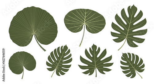 © Ayesha, Obraz premium Collection of various green tropical leaf illustrations with detailed vein patterns for decorative design and botanical art