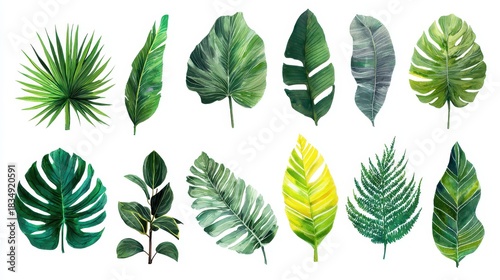 Fototapeta premium Collection of various green tropical leaves isolated on white for design and decor inspiration in natural themes