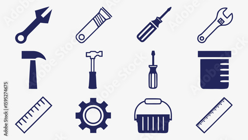 Fototapeta premium Collection of various hand tools and mechanical parts icons on a white...