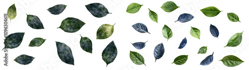 Obraz premium collection of various leaves in different shades of green and blue, showcasing their unique shapes and textures, perfect for nature themed designs