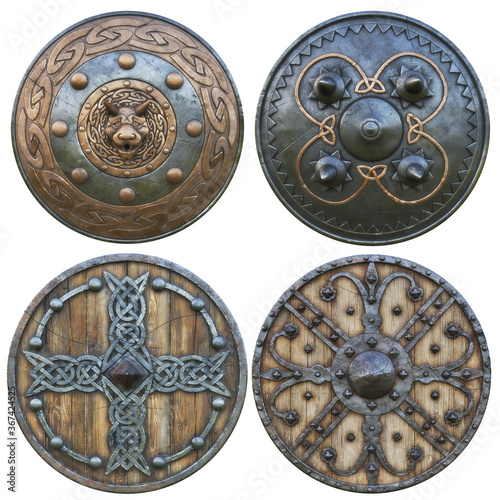 © Digital Storm, Naklejka premium Collection of various military round shields with metal and wood construction and decorative designs on an isolated white background. 3d rendering