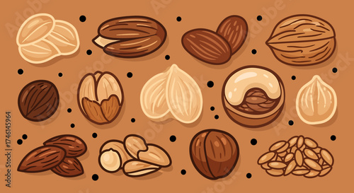© DFX, Obraz premium Collection of Various Nuts and Seeds in Cartoon Style.