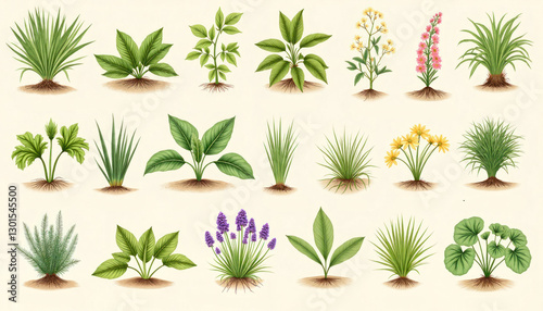 Naklejka premium Collection of various plants and herbs illustrated in a detailed botanical style