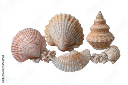 © bright, Obraz premium Collection of various seashells including scallop and spiral shells arranged on white background showcasing natural patterns and textures