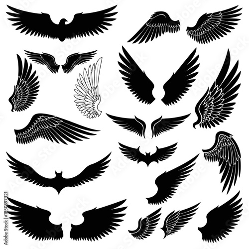 © udin, Obraz premium Collection of Various Wing Designs in Black and White.