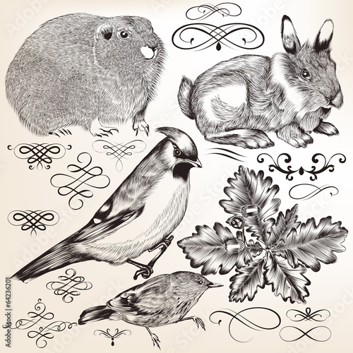 Fototapeta premium Collection of vector detailed elements and animals