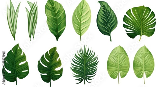 Fototapeta premium Collection of vibrant tropical leaves isolated on a white background showcasing diverse exotic foliage and rich green hues