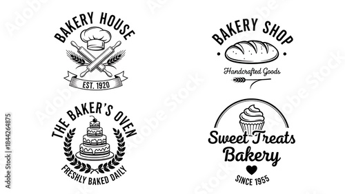 Fototapeta premium Collection of vintage bakery logo designs and badges with bread, cake, and cupcake icons - Retro bakery shop emblems set