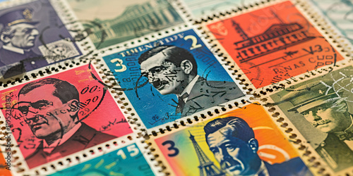 © Lila Patel, Fototapeta premium Collection of Vintage Postage Stamps with Portraits and Architectural Designs