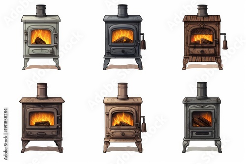 Fototapeta premium Collection of vintage style wood burning stoves with glowing fire inside