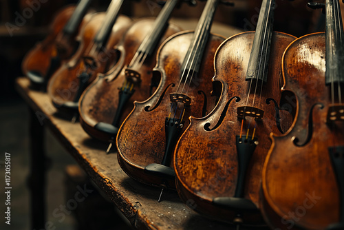 © Василь Тігай, Naklejka premium Collection of Vintage Violins Displayed