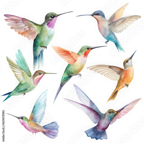 Fototapeta premium Collection of watercolor hummingbirds in flight isolated on transparent background