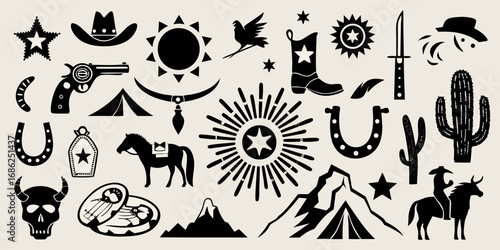 © Sunil123, Naklejka premium Collection of western and cowboy icons in silhouette against a light background