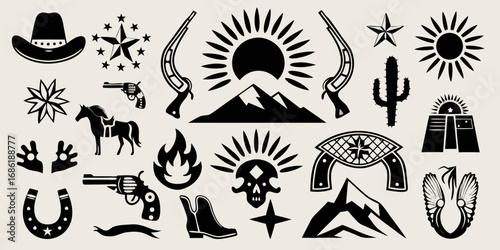 Fototapeta premium Collection of western and cowboy themed graphic design elements and icons in black silhouette