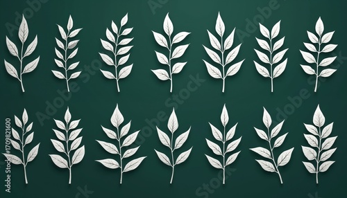 Fototapeta premium Collection of white decorative leaf illustrations arranged in a grid on a dark green background. Features minimalist botanical designs with clear outlines and a modern, abstract aesthetic.
