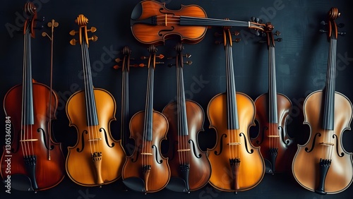© Maks, Naklejka premium Collection of wooden violins arranged in a row on a dark background.