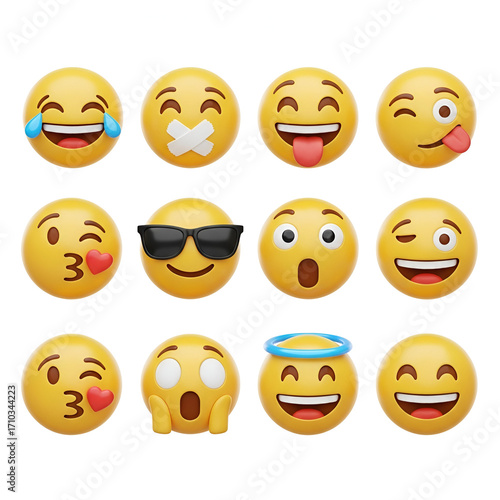 © CatalystVisuals, Fototapeta premium Collection of 12 yellow emoji faces with different expressions isolated on white background