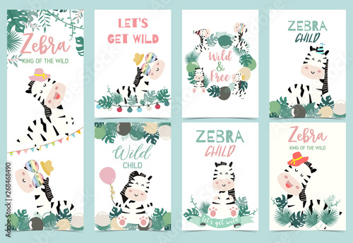Fototapeta premium Collection of zebra party set with hat,palm,balloon,ribbon and light