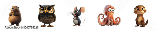 © Ace64 Studio, Naklejka premium Collection set of animals Beaver Owl Mouse Octopus Otter isolated on transparent background 3D style