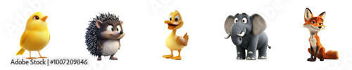 Naklejka premium Collection set of animals Canary Hedgehog Duck Elephant Fox isolated on transparent background 3D fun cartoon style