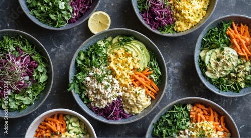 Fototapeta premium collection six bowls different types food arranged dark
