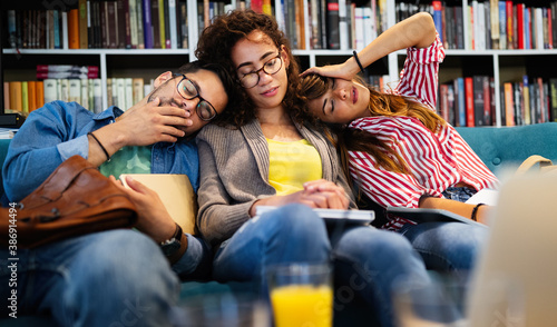 © NDABCREATIVITY, Obraz premium College, study, university and education concept. Group of tired students learning in library