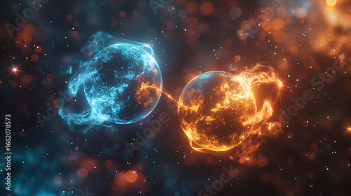 © Jan, Obraz premium Collision of blue and orange energy spheres in space