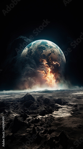 Fototapeta premium Collision of planets in space. Global catastrophe on earth, view from the lunar base Generative AI