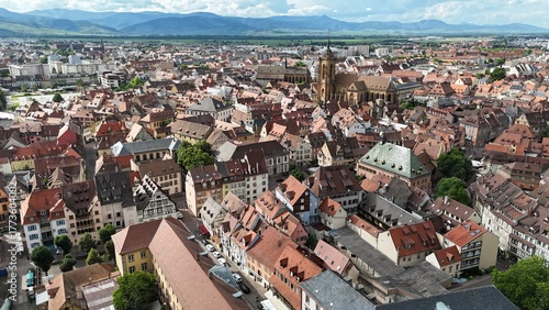 Obraz premium Colmar France old town centre drone, aerial low angle