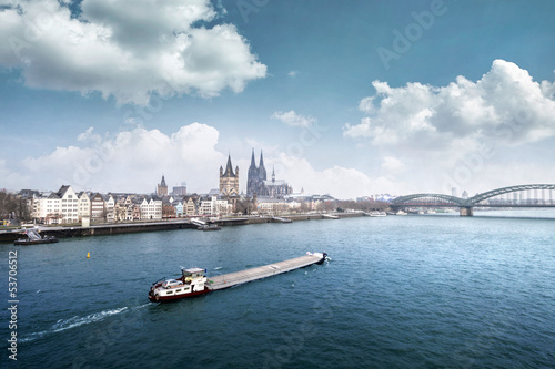 Naklejka premium Cologne cityline with cargo ship on rhine