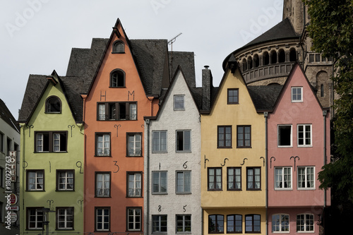 © LAURA, Fototapeta premium COLOGNE, GERMANY - SEPTEMBER 11, 2016: Colorful houses in Bavarian style and the Romanesque Catholic church "Gross Sankt Martin" (Great St. Martin) in the old town of Cologne, North Rhine-Westphalia