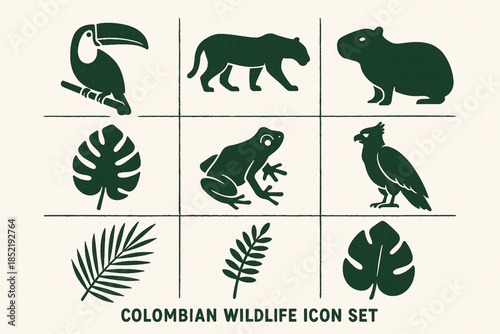 Fototapeta premium Colombian Wildlife Icon Set with Toucan, Jaguar and Tropical Animals in...