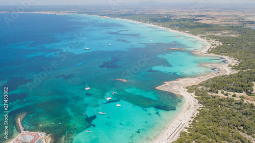 © Matteo Ceruti, Obraz premium Colonia Sant Jordi, spain. Amazing drone aerial landscape of the charming beaches Estanys and Es Trencs