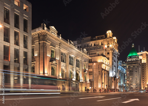Naklejka premium Colonial architecture at Bund Boulevard at night, Shanghai, China